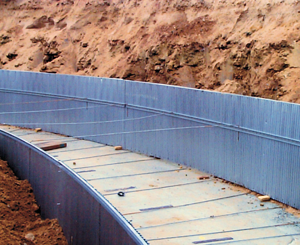 Because it is a matter of a lost casing here, we recommend that the casing be propped up by filling it up with dirt in the conventional manner (Photos 9, 10, 11). In the overlap area, approx. every 3.4 m, we commend that the customer secure the elements with 3-4 tapping screws. Formed pieces, e.g. angled elements (Photo 17), are produced quickly and easily by cutting into the cross-sections and bending to required position on site. The system can be supplied with base plate laying. Here an additional cross-section is welded onto the interior of the exterior casing at the plant for insertion into the upper spacer (Photo 14-17).