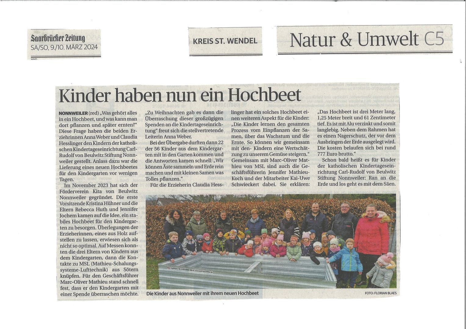 Die Kita Carl-Rudolf von Beulwitz Stiftung Nonnweiler hat nun ein Hochbeet aus dem Hause MSL. Wie es dazu kam und wie sehr sich die Kinder darüber freuen, ist in dem Zeitungsartikel der Saarbrücker Zeitung vom 09./10. März 2024 zusammengefasst.